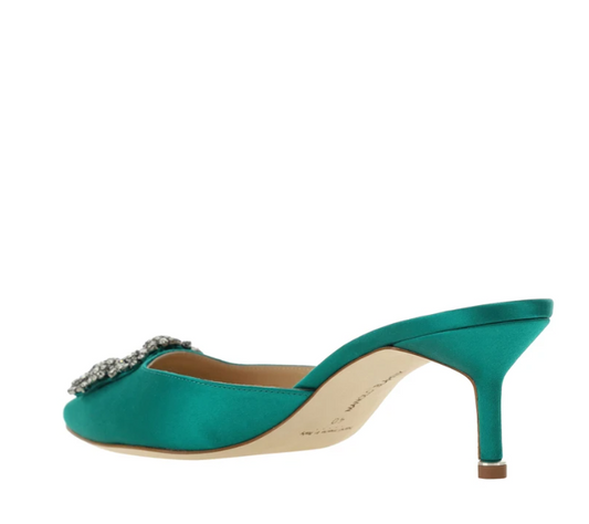 Manolo Blahnik Hangisimu Green Satin Jewel Buckle 50mm Low Heel Mules