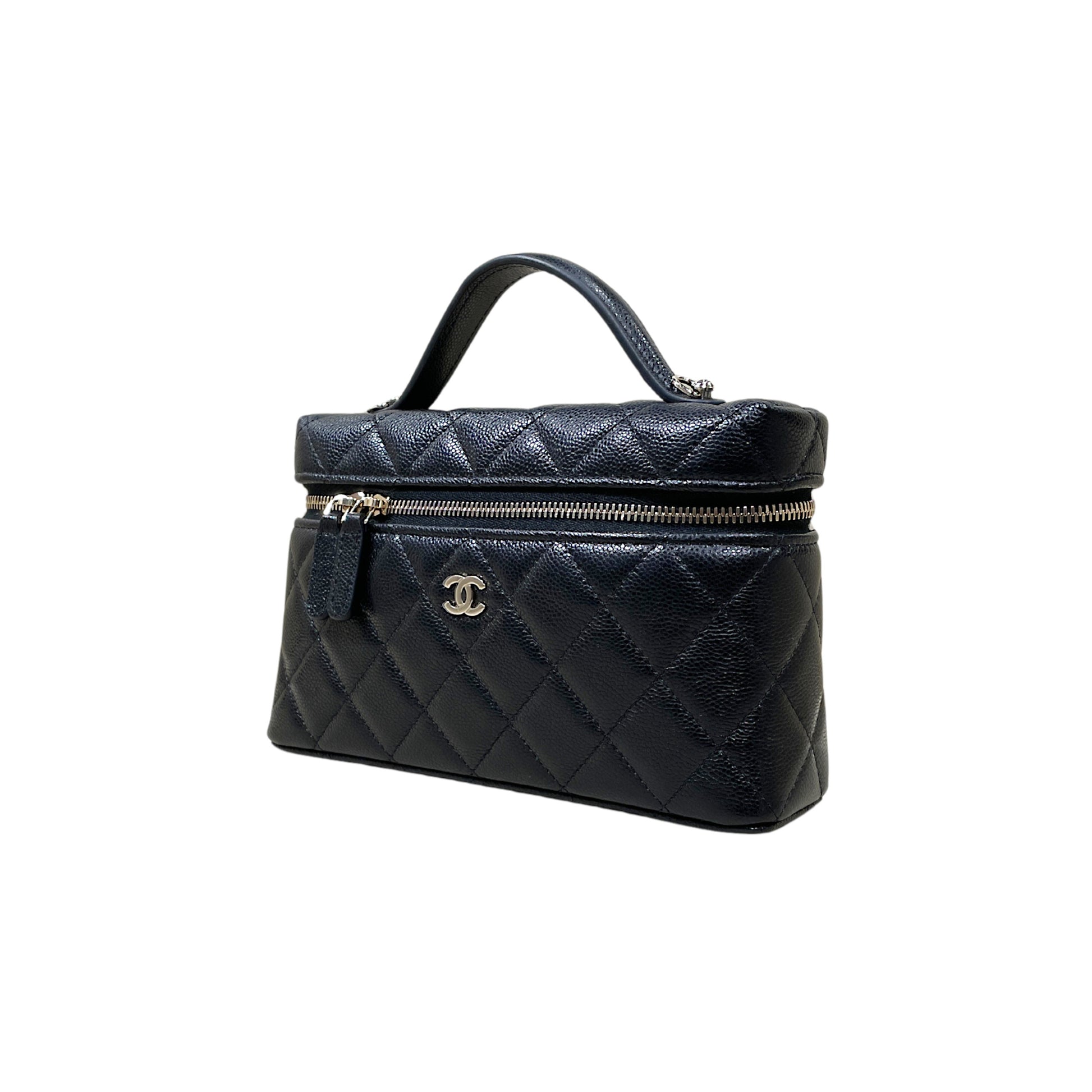 This Top Handle Vanity Case is crafted in Chanel's signature caviar leather—a luxurious grained shiny calfskin that's supple and sturdy—and gold-tone metal chain and hardware. The pebbled leather finish makes it more casual than Chanel's lambskin variants but makes it great as an everyday bag. Great as a make-up case, travel vanity, or mini handbag.