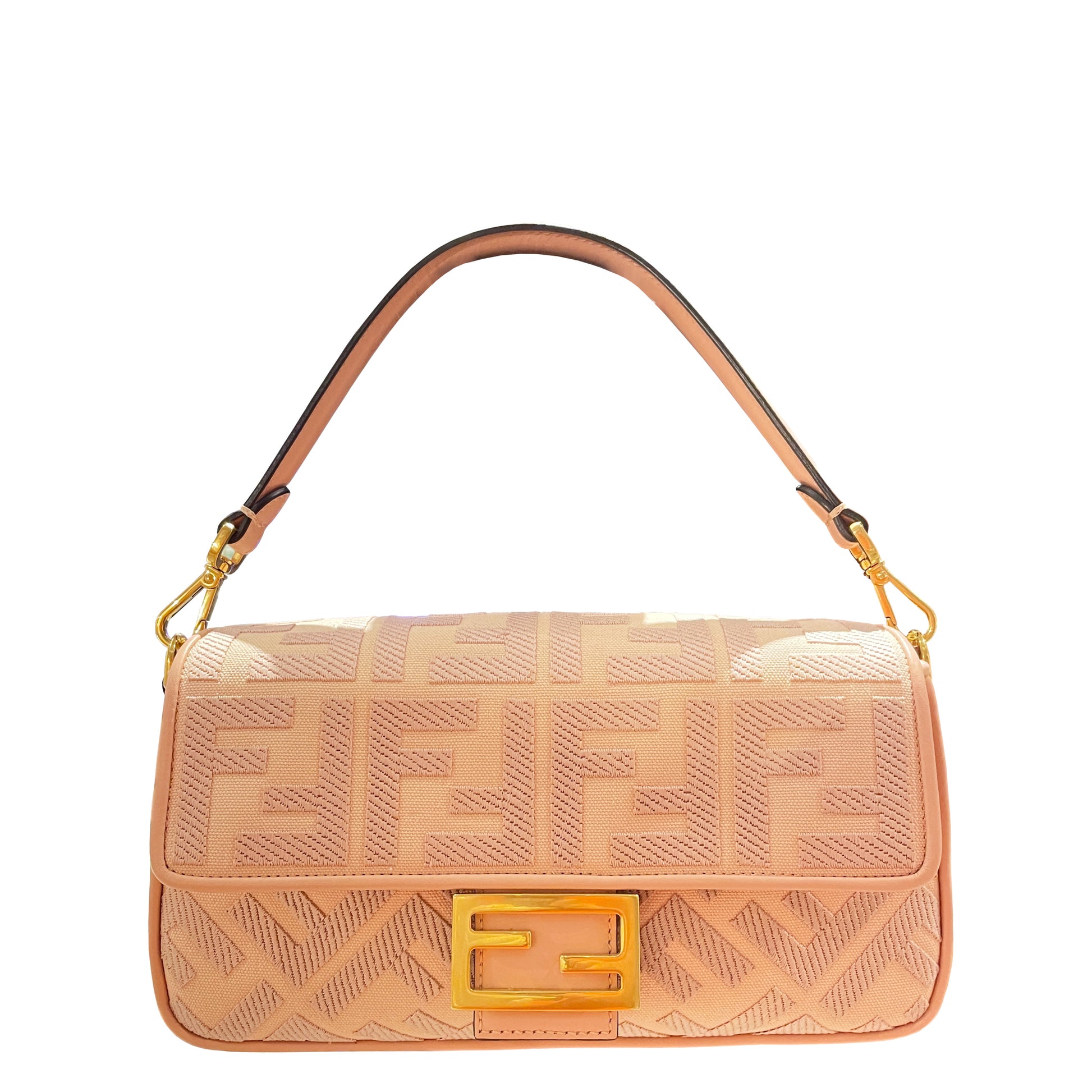 Timeless and versatile, this Baguette is crafted in baby pink canvas with the iconic FF brand thread embroidery and calfskin trimmings. Two extra straps provide alternative carry options to fit any mood and style.