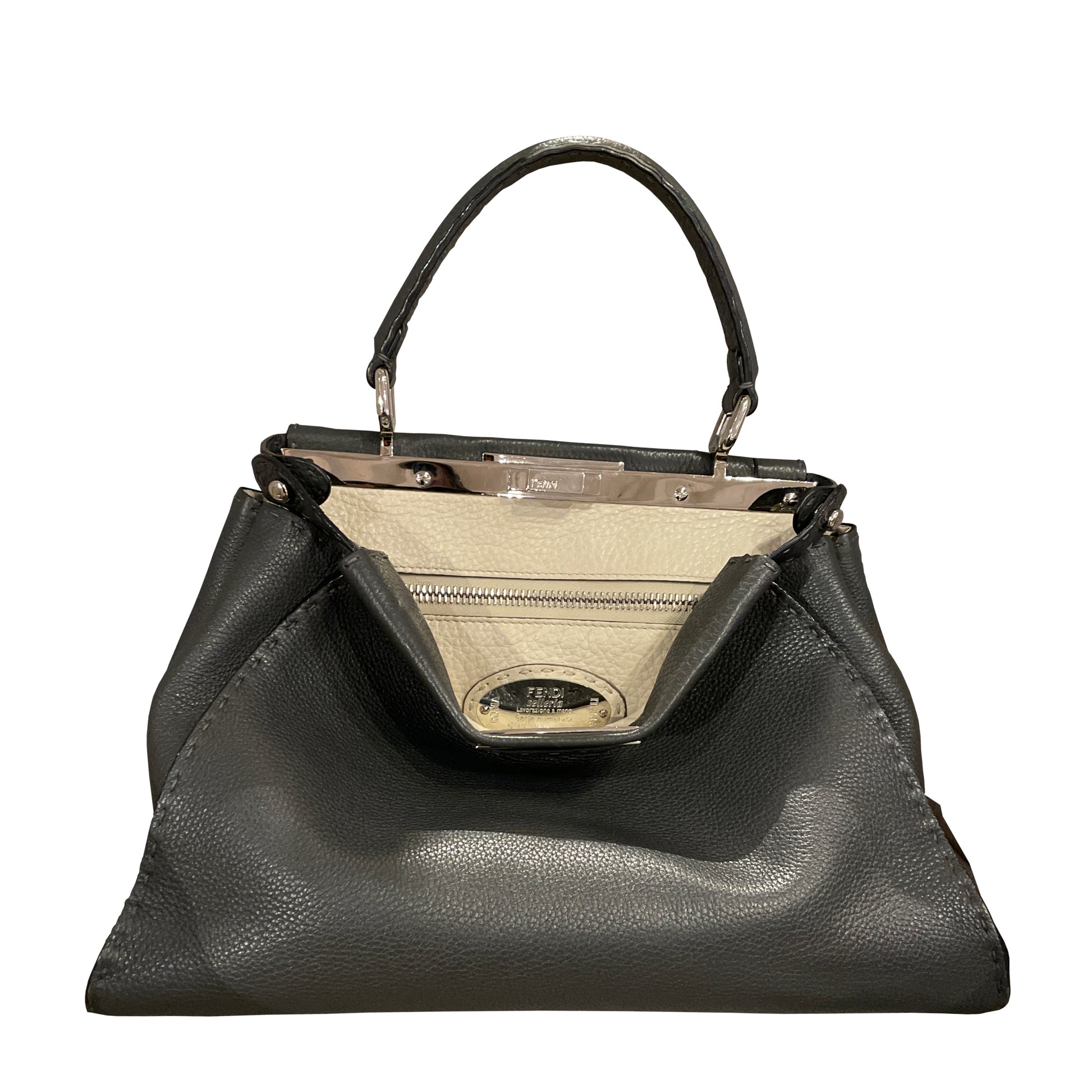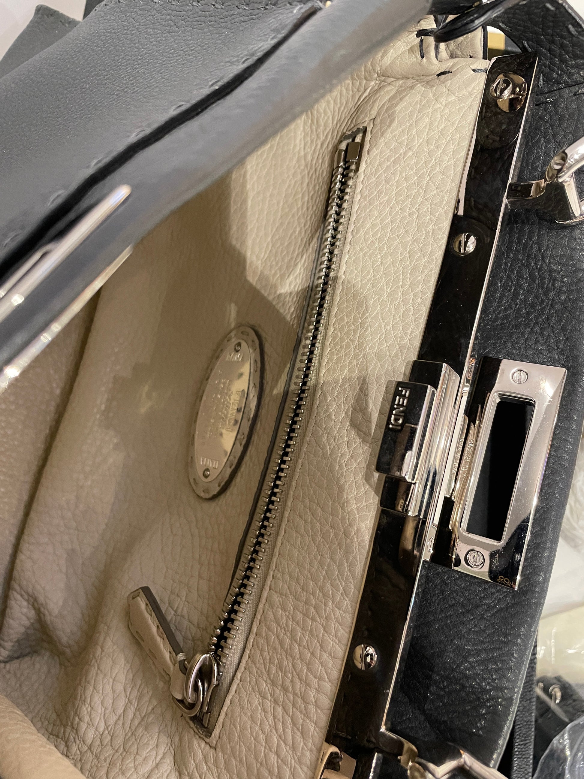 - Interior hand-sewn Fendi Selleria numbered silver tag