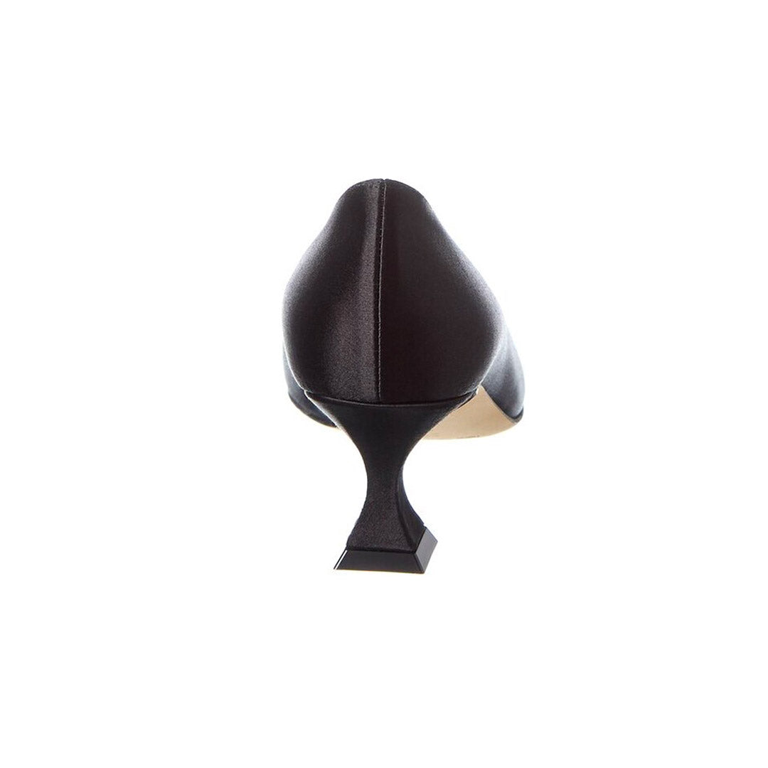 The FABETA 50 Satin Pump is a Manolo Blahnik shoe featuring signature flared heels and crystal and pearl square buckle similar to that of the designer's iconic Hangisi jewel buckle along with 50mm kitten heel stilettos and pointed toes.